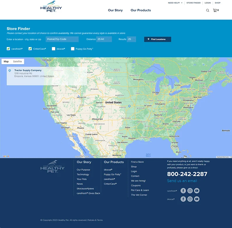 Since Healthy Pet products are available all over the world, it was important to them to make it easy to find the closest retailer to their audience. Their store finder was customized to support their product lines and integrate harmoniously with the site’s overall look and feel.
