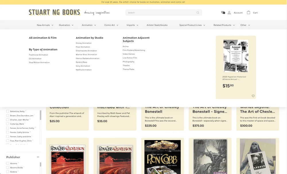 At FDG Web, we pride ourselves on crafting tailored solutions to elevate our clients’ online presence, and our recent implementation of a mega menu stands as a testament to our commitment to excellence. By integrating this expansive navigation feature, we’ve revolutionized the browsing experience for their customers, providing seamless access to a vast array of literary categories, authors, and special collections. This intuitive mega menu not only streamlines navigation but also enhances discoverability, enabling users to explore the bookstore’s extensive catalog with ease. With clear pathways to genres, illustration era, and niche interests, the mega menu fosters increased engagement and conversion rates, ultimately driving business growth for our client. Our strategic approach to web design ensures that every element serves a purpose, and the mega menu is a prime example of how we prioritize usability and functionality to deliver exceptional results for our clients.